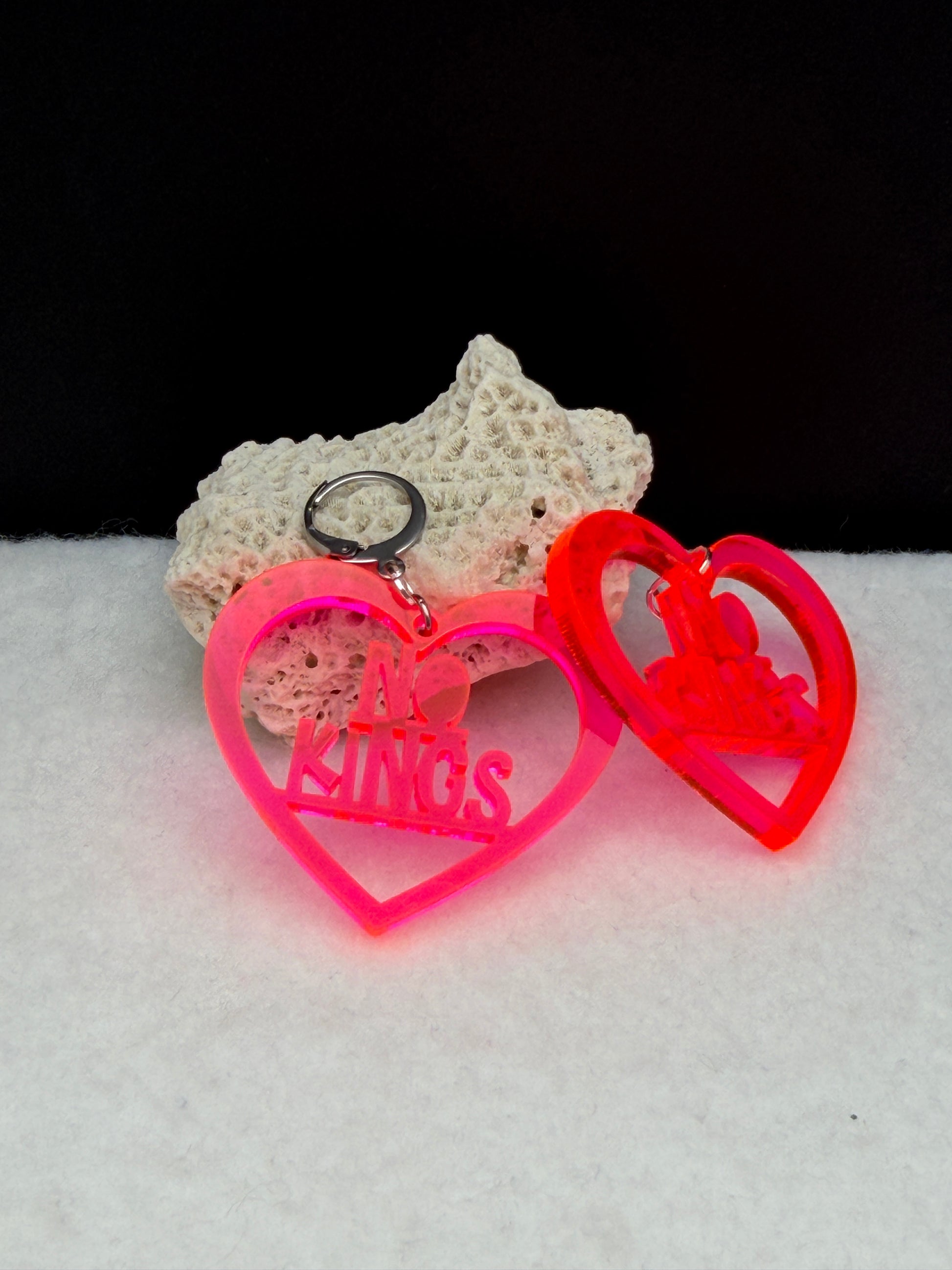 No Kings. In neon acrylic. Measures 1.5” wide and 2” drop. Laser cut perfection. Three styles to choose from.