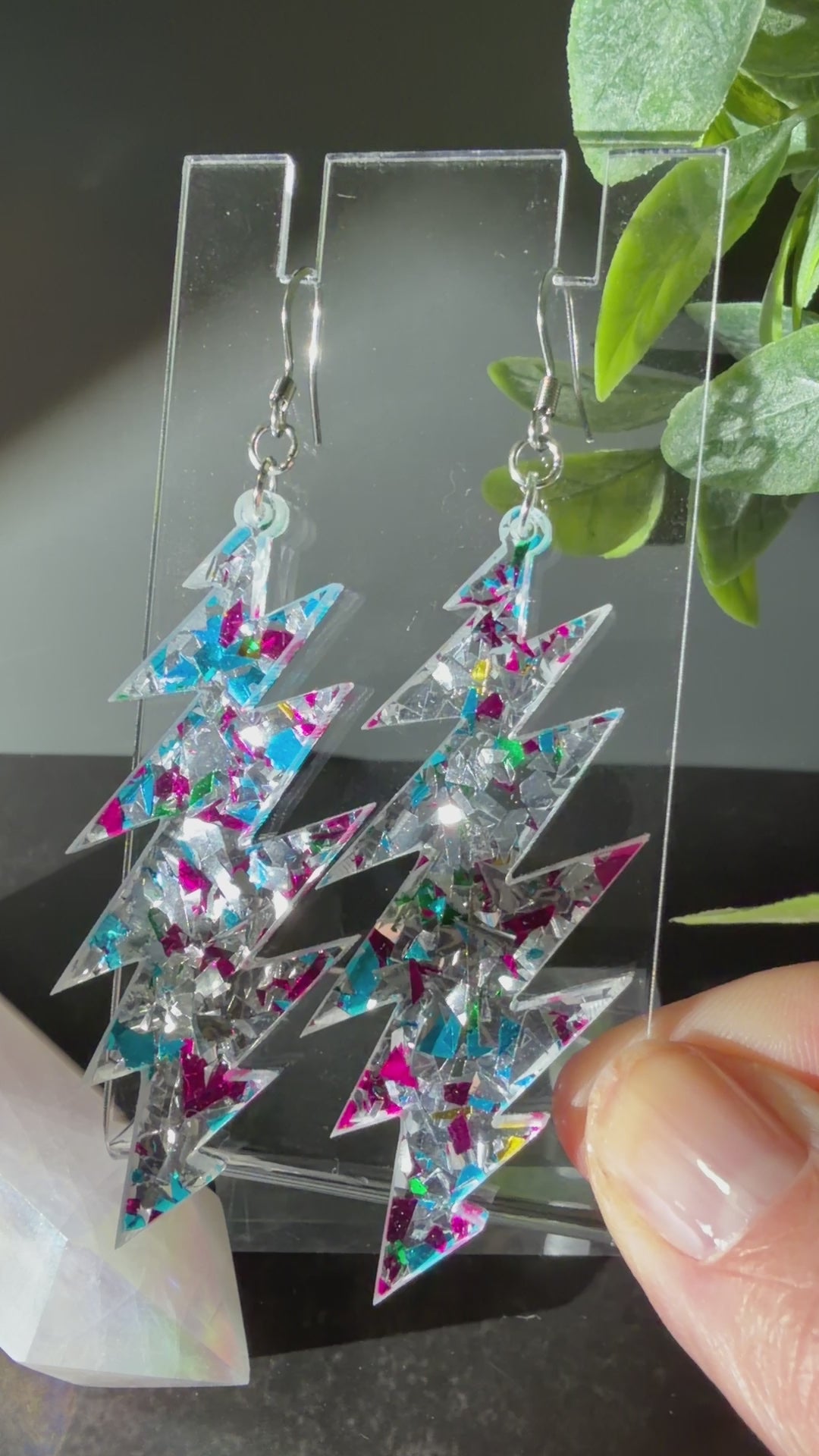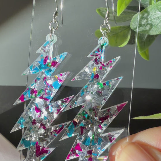 These iconic Grateful Dead 13-point bolt earrings catch light and sparkle with pink blue and silver glitter as you groove. Crafted from laser-cut glitter acrylic and hand-assembled, they are lightweight and easy to wear for all-day fun.