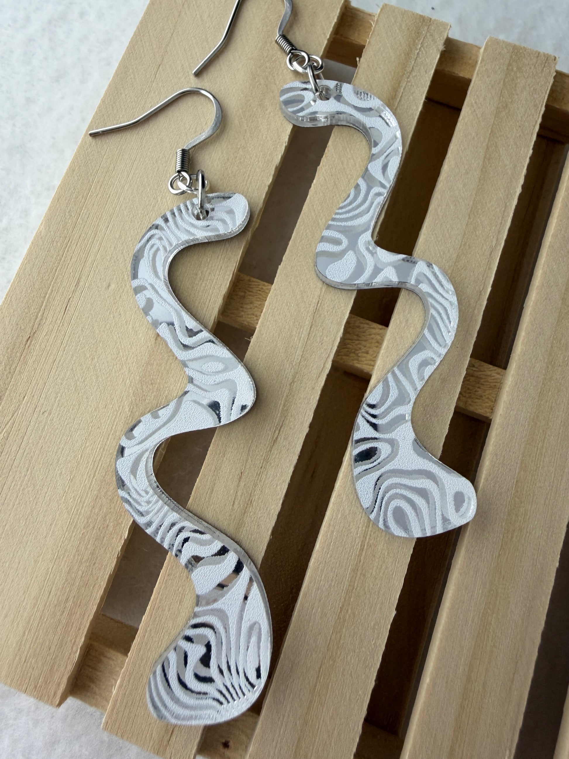 Silver mirror squiggle earrings. Mirror Acrylic with psychedelic wavy pattern UV printed on top. Measures about 2.5". On hypoallergenic stainless steel french earring wires. Lightweight and totally fabulous.